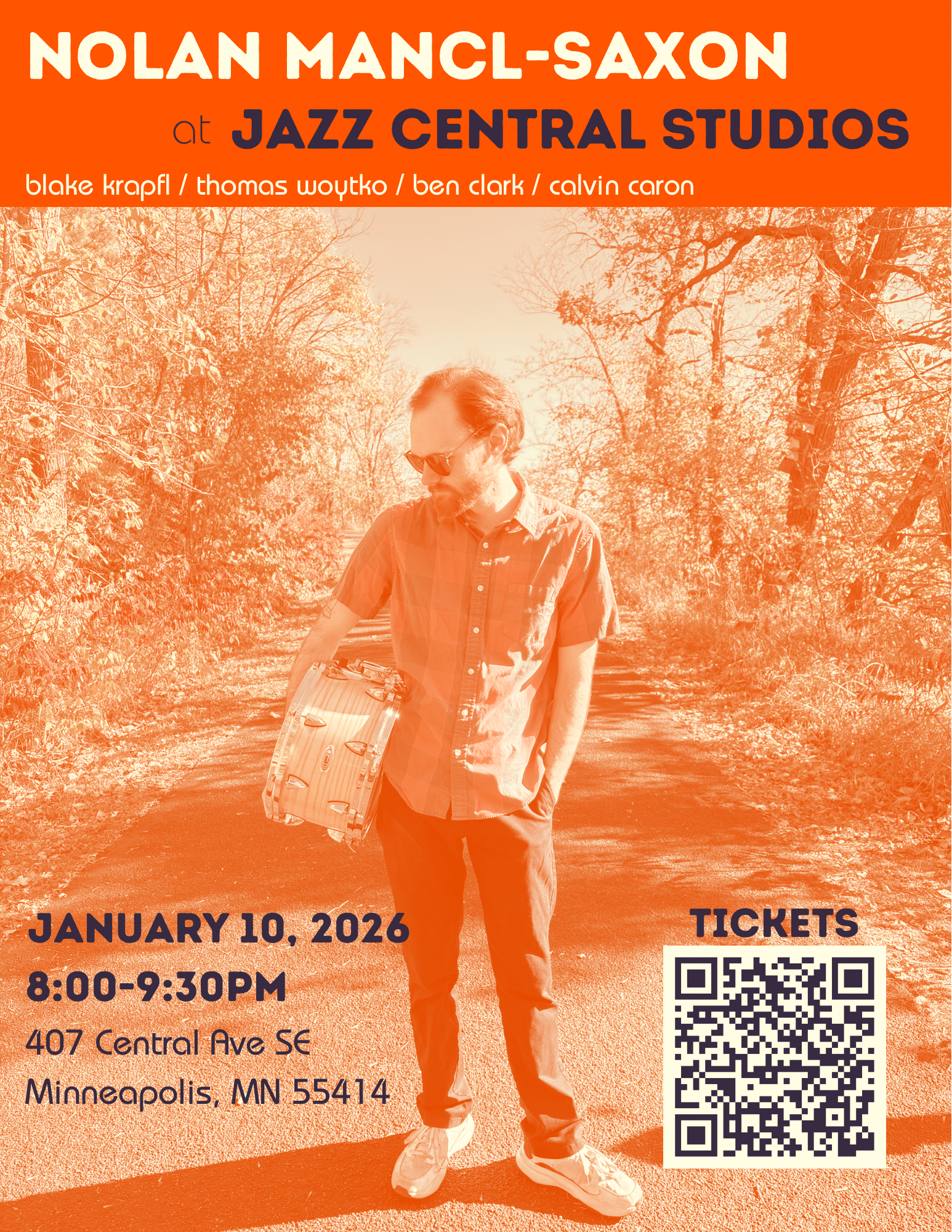 Nolan Mancl-Saxon: drums, compositions Blake Krapfl: saxophone Thomas Woytko: trombone Ben Clark: piano Calvin Caron: bass
